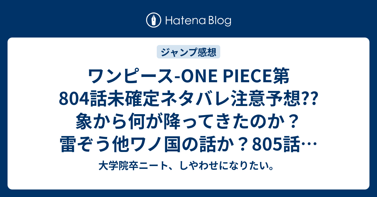 ワンピース One Piece第804話未確定ネタバレ注意予想 象から何が降ってきたのか 雷ぞう他ワノ国の話か 805話で登象完了か 47号は休載で載ってない こちらジャンプ感想次回 画バレないよ 大学院卒ニート しやわせになりたい